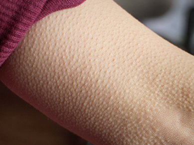 모공각화증으로 팔, 다리 등의 바깥 측면 모공이 있는 부분에 작은 돌기가 나오면서 소위 말하는 닭살처럼 보이는 질환을 말합니다. 일부 유전적 원인에 의해서도 발생할 수 있으며, 피부를 보호하는 단백질 중 하나인 각질(케라틴)이 과도하게 생성되어 탈락되지 못하고 모공을 막는 경우에 발생합니다.