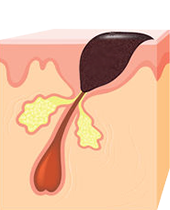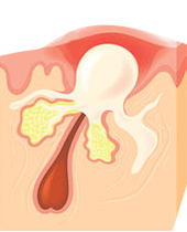 여드름 부위에 고름이 생기면서 염증이 심해지고 점점 붓는 상태입니다. 살짝 만지기만 해도 통증이 느껴질 정도로 증상이 심해집니다. 만지면 고름이 차 있는 것처럼 느껴지고 후에 흉터를 남길 가능성이 높습니다.